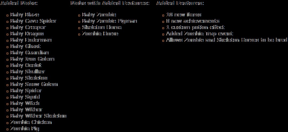Разнообразьте свои приключения в Minecraft с модом Baby Mobs! Уникальные детёныши мобов принесут в вашу игру новые ощущения, множественные возможности для взаимодействий и новые вызовы. Позвольте себе погрузиться в этот волшебный мир с крошечными друзьями, которые смогут удивить вас своими способностями и поведением!