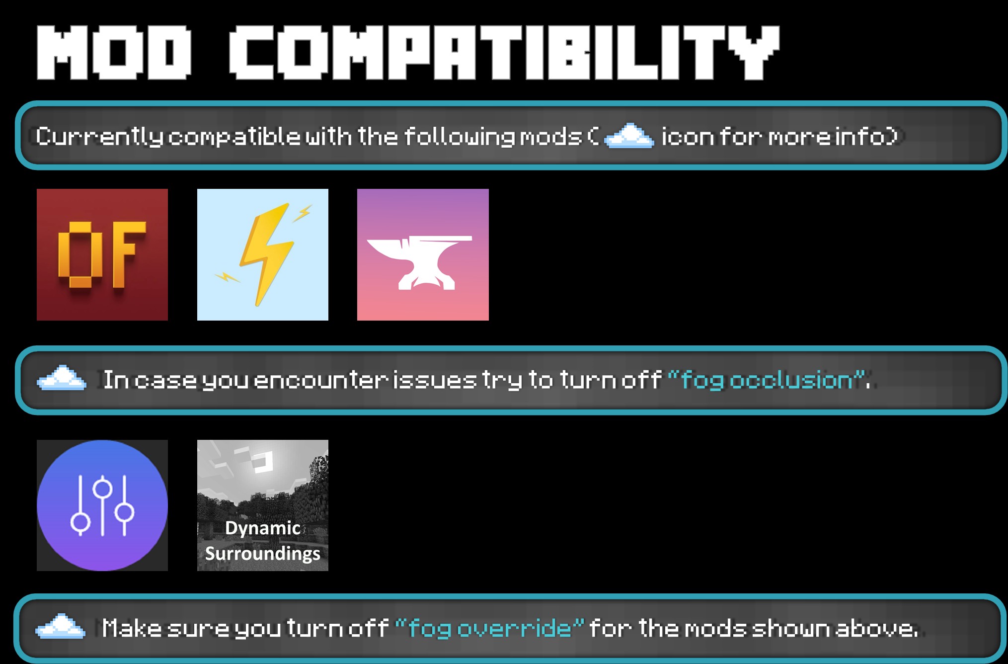 Better Fog оптимизирован для повышения производительности игры. Установленная черный список для измерений поможет вам ограничить использование мода в ненужных мирах, сохраняя плавность и скорость работы игры.