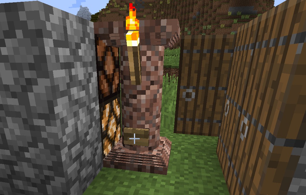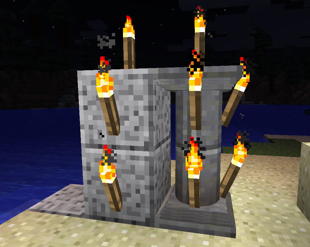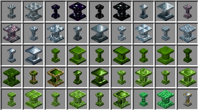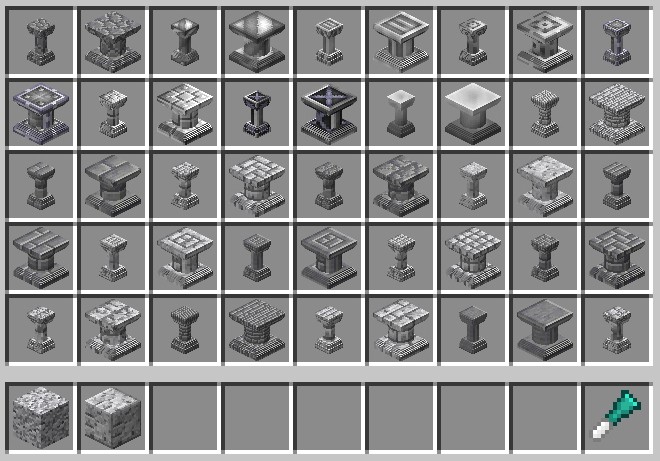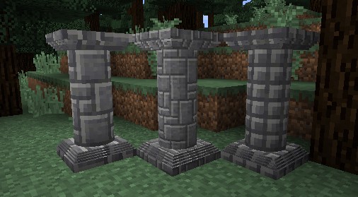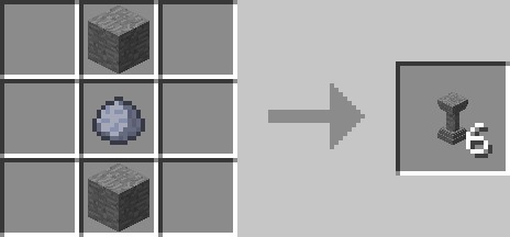 Создание тонкой колонны станет простым процессом – просто разместите вертикально три блока в центре верстака, используя при этом шарик глины в качестве среднего ингредиента. Обратите внимание, что в версии до 3.2.0 рецепт требовал три одинаковых блока. Для полной колонны используйте безформенный рецепт, состоящий из двух тонких колонн, позволяя добавлять разнообразие в ваши конструкции.