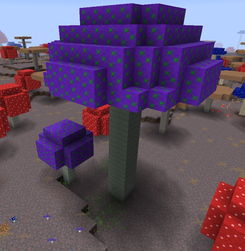 Теперь огромные грибы могут расти случайным образом с вероятностью 1:25, подобно деревьям. Главное отличие в том, что огромные грибы могут расти только на определенных блоках. На мицилии и подзоле они могут появляться при любом уровне света, в то время как на грязи и траве их рост возможен только при уровне света ниже 13, что можно настроить в конфигурации.