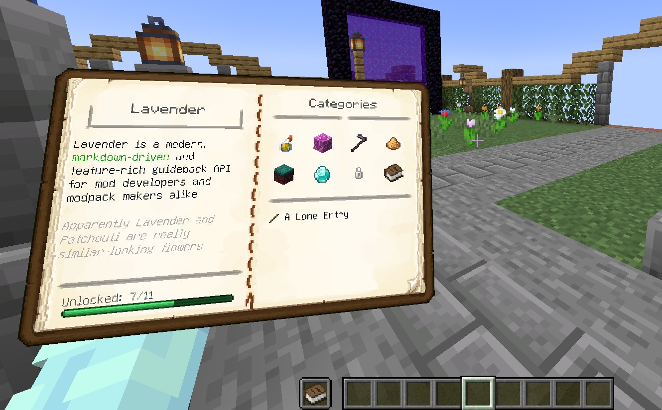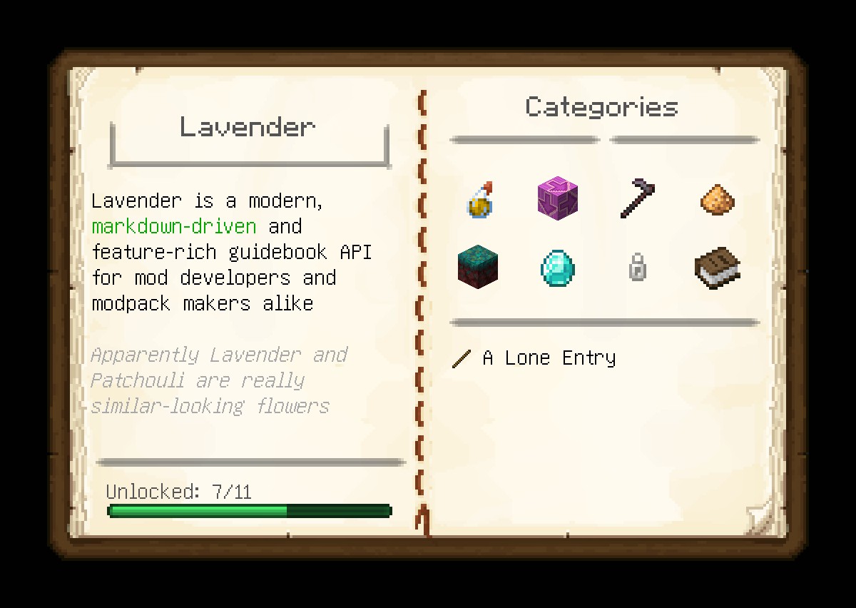 Мод Lavender API — это уникальный инструмент, созданный для моддеров и разработчиков модпаков в Minecraft, который позволяет создавать удобные и наглядные гайды и документацию прямо в игре. Благодаря простому и интуитивно понятному синтаксису Markdown, пользователи смогут легко разрабатывать и оформлять свои руководства, интегрируя их с игровым процессом.