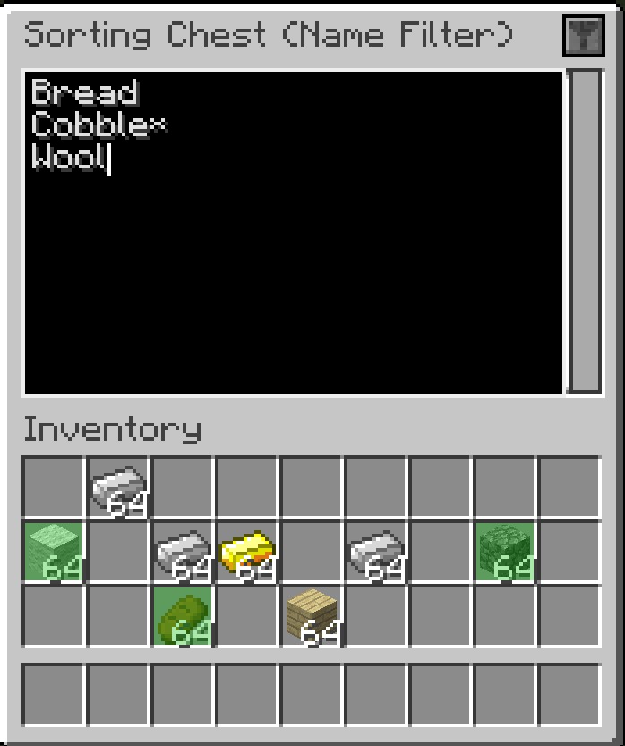 - Сортировочный интерфейс — подключайте инвентари с других модов к вашей сортировочной сети для максимальной функциональности.