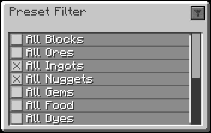 - Предустановленные фильтры — быстро сортируйте такие предметы, как все слитки или все руды, благодаря готовым решениям.