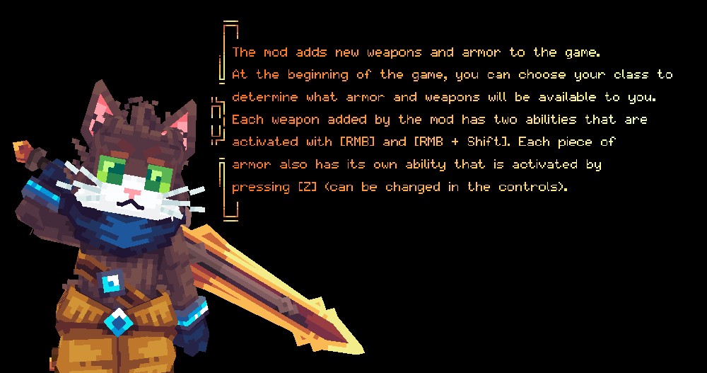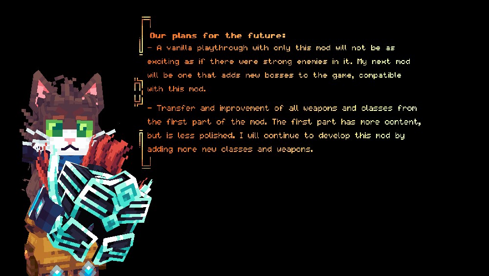 С модом ⚔️ RPG style More Weapons! вы можете ожидать много нового контента. В планах разработчика – введение новых боссов, которые сделают ваше путешествие еще более захватывающим, а также перенос и улучшение старых классов и оружия. Мод был создан на основе энтузиазма, и ваш интерес к нему поможет в дальнейшем развитии!