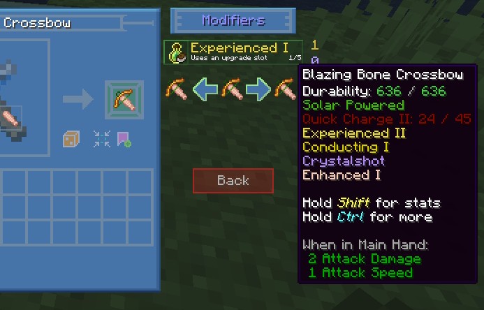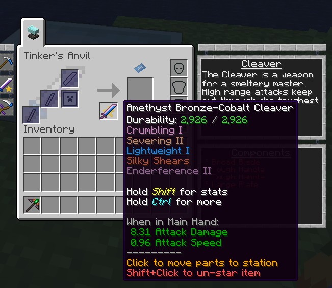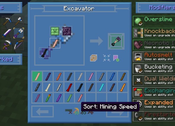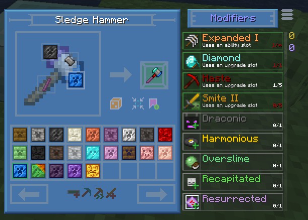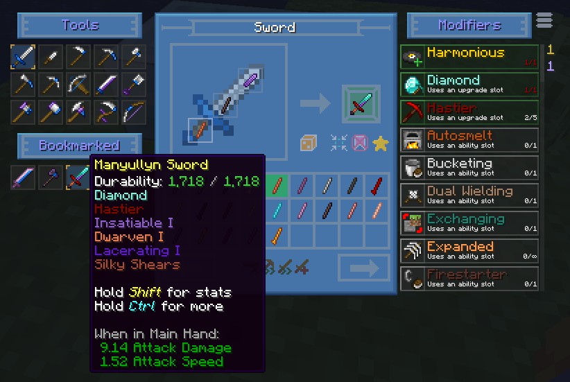 Когда вы будете готовы создать окончательный инструмент, просто отметьте закладку нужного инструмента, чтобы закрепить ее на Tinker Station или Tinkers Anvil. Кликнув по значку инструмента, система автоматически разместит необходимые части в правильные слоты, при условии, что они есть в вашем инвентаре. Мод также подскажет, какие детали отсутствуют или неверно расположены для завершения крафта.