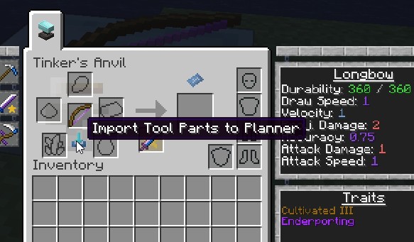 С установкой Tinkers Planner вы заметите новый значок чертежа на Tinker Station и Tinkers Anvil. Просто кликните на этот значок, и откроется уникальный интерфейс планировщика. Здесь можно чертить инструменты и просматривать их статистику максимально удобно.