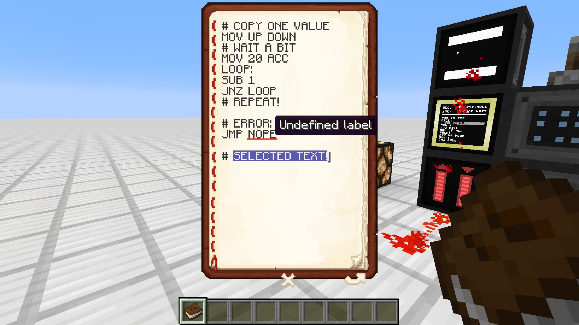 Программирование компьютеров TIS-3D можно выполнять с помощью обычной Книги и Перо или специальной Кодовой Библии TIS-3D. Чтобы установить программу, просто используйте книгу на модуле выполнения. Каждая книга будет рассматриваться как одна длинная программа, а страницы в Кодовой Библии будут восприниматься как отдельные программы.