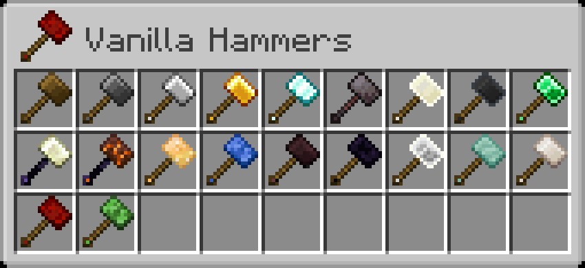 Этот мод значительно упрощает процесс добычи, позволяя игрокам сосредоточиться на исследовании и строительстве. Vanilla Hammers идеально дополняет стандартный игровой процесс, сохраняя атмосферу Minecraft, но в то же время добавляя новые возможные механики и инструменты. Находите новые материалы, улучшайте свои орудия и наслаждайтесь игрой с Vanilla Hammers!